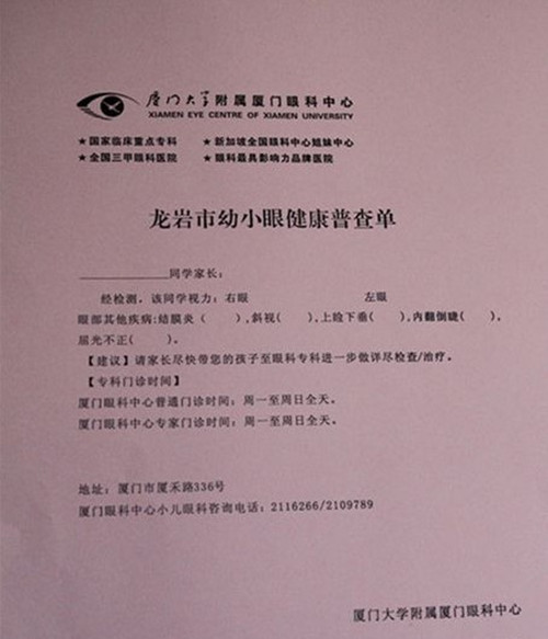 眼睛是心靈的窗口,保護(hù)眼睛從小抓起。2013年12月3日,廈門(mén)大學(xué)附屬?gòu)B門(mén)眼科中心斜弱視及小兒眼科楊美瓊主任帶領(lǐng)小兒眼科專家團(tuán)隊(duì)到龍巖市多所小學(xué)、幼兒園無(wú)償為上千個(gè)孩子進(jìn)行詳細(xì)的視力檢查,溪南小學(xué)是這次普查活動(dòng)的其中一站。