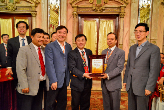 在中國駐尼泊爾大使吳春太先生(右一)舉行的答謝宴會(huì)上,尼泊爾阿尼哥協(xié)會(huì)主席Sarbottam Shrestha (右二) 向姚曉明博士頒發(fā)感謝狀。
