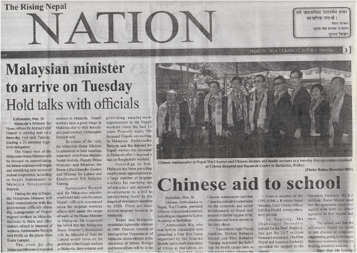 3月29日晚,中華人民共和國駐尼泊爾特命全權(quán)大使吳春太先生及夫人宴請光明行全體成員。他在宴會(huì)上發(fā)表熱情洋溢的講話。吳大使說,這次尼泊爾光明行很有意義,中尼兩國是友好鄰邦,兩國交往歷史淵源流長。這次光明行在尼泊爾北部山區(qū)的巴勒比斯舉行,這里民風(fēng)淳樸,對中國有著友好的感情,但是這個(gè)地區(qū)由于道路所限,缺醫(yī)少藥,特別是一些老年人患有白內(nèi)障,所以這一次光明行,對于促進(jìn)兩國人民友誼,特別是解除白內(nèi)障患者的痛苦具有特殊意義。另外一方面,我們之所以選擇巴勒比斯,是因?yàn)樗侵心嵊押弥钒⒛岣绻匪?jīng)過的一個(gè)重要城市,這里見證了兩國人民的千年交往史。中國政府鼓勵(lì)兩國人民開展民間友好交往,我們現(xiàn)在的外交更加積極更加全面。去年中央召開了周邊外交工作座談會(huì),明確提出要進(jìn)一步加強(qiáng)與周邊國家的友好關(guān)系,貫徹親、誠、惠、容的新的外交理念,鼓勵(lì)民間交往。這次活動(dòng)體現(xiàn)了中央針對周邊國家外交工作的思想,體現(xiàn)了民間外交的理念。