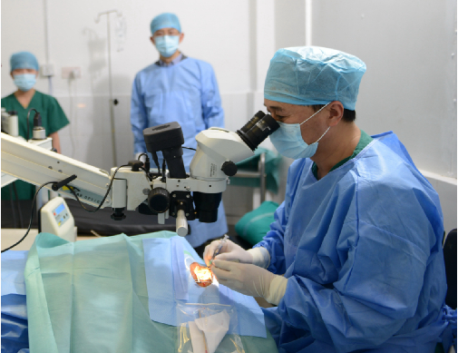 姚曉明博士在簡陋的手術(shù)室里為尼泊爾患者實(shí)施復(fù)明手術(shù)。