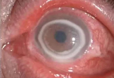 眼表與角膜病科學(xué)科帶頭人吳護(hù)平主任醫(yī)師在初診時,發(fā)現(xiàn)蘇師傅左眼的視力僅有0.3,通過裂隙燈和角膜熒光染色檢查,可以看到蘇師傅的角膜有明顯的炎癥性病變,炎癥細(xì)胞已經(jīng)浸潤到角膜組織中,形成了一個環(huán)狀浸潤,角膜上皮大面積破損,出現(xiàn)了水腫和潰瘍。