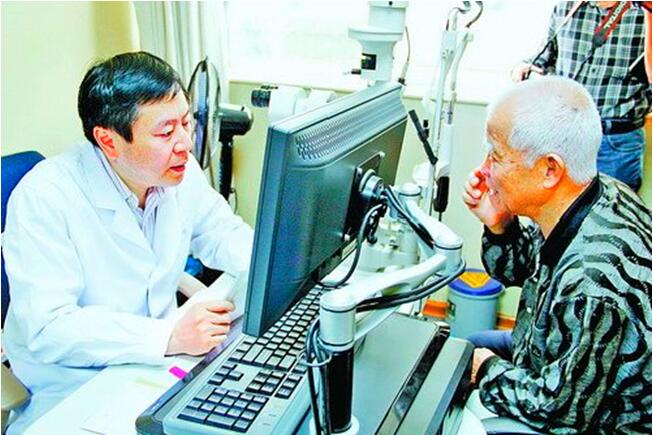 著名眼科專家盧奕教授為預(yù)約患者檢查眼睛