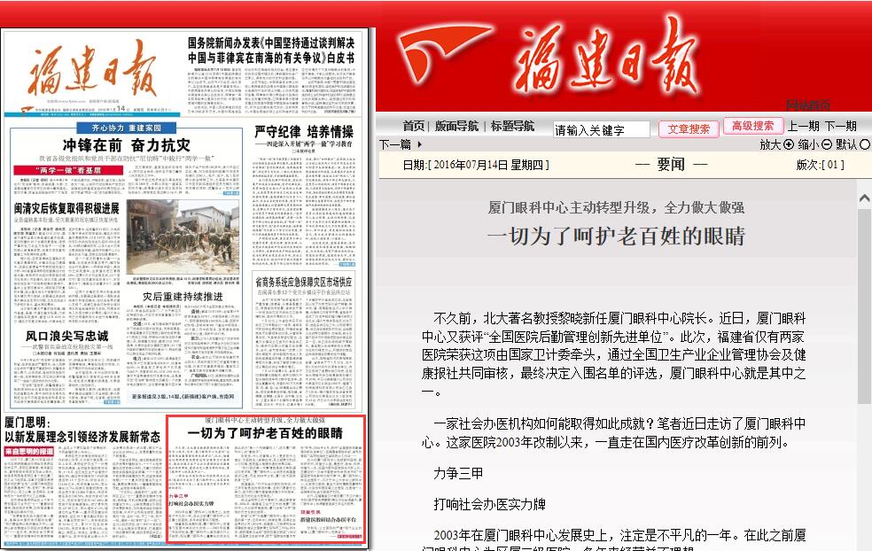 近日,福建日報記者前往廈門眼科中心,對這家作為改制典范的醫(yī)院進行了深入采訪。7月14日,福建日報頭版刊登了報道,特別對廈門眼科中心改制以來的轉(zhuǎn)型升級、醫(yī)療服務(wù)和人才引進等方面的創(chuàng)新舉措給予了高度的肯定。相關(guān)文章轉(zhuǎn)載如下: