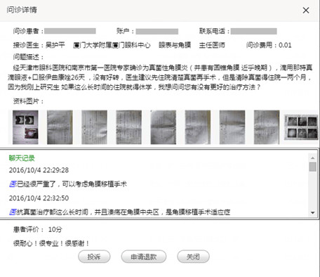 眼科醫(yī)院和南京第一醫(yī)院專家確診為真菌性角膜炎,并患有圓錐角膜近乎晚期,使用相關藥物沒有好轉,江西當?shù)氐尼t(yī)生建議其先住院清除真菌再手術。因為清除真菌得住院一兩個月,剛上研究生的他如果長時間住院就得休學,實在進退兩難的他,通過眼科通APP接通了廈門眼科中心眼表與角膜??频膶W科帶頭人吳護平主任的問診服務,盡管已經(jīng)22:30,吳護平主任還是耐心解答了他的疑問,并且給出了盡快做角膜移植手術的建議。因為廈門眼科中心有與華廈眼科醫(yī)院集團下各地的眼庫聯(lián)動,所以患者很快就有角膜材料。吳護平30分鐘內的4個答復就大大緩解了小雷的焦慮,避免了休學危機,他連連道謝并打算盡快接受手術。