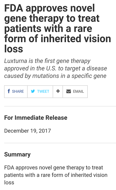 圣誕前夕,從美國傳來了重磅消息:“針對由RPE65基因突變導(dǎo)致的雷柏氏先天性黑朦2型(RPE65基因突變引起)的基因替代療法藥物L(fēng)uxturna(voretigene neparvovec-rzyl)獲FDA批準(zhǔn)上市!失明患者重見光明為時不遠(yuǎn)!