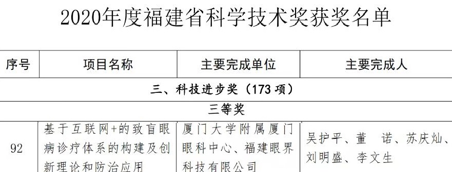 【文章導讀】近日,福建省人民政府發(fā)布《福建省人民政府關于 2020 年度省科學技術獎勵的決定》,其中廈門眼科中心憑借“基于互聯(lián)網(wǎng)+的致盲眼病診療體系的構建及創(chuàng)新理論和防治應用”項目上榜