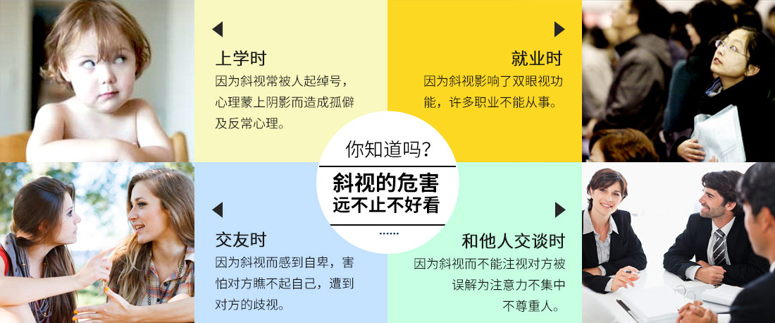 斜視除影響美觀外,還可造成視力和視功能上的不良后果。如果在視覺發(fā)育期內(nèi)(12歲以前)及時治療,除了可矯正眼球偏斜外,還可以使斜頸現(xiàn)象消失,脊柱彎曲及面部發(fā)育得到調(diào)整,也為視力及立體視覺的正常發(fā)育清除了障礙。如果視覺發(fā)育成熟后進(jìn)行治療,則僅能改善外觀,斜視眼的視力不會提高,也不能獲得雙眼單視的功能,對工作及職業(yè)的選擇有一定的影響。