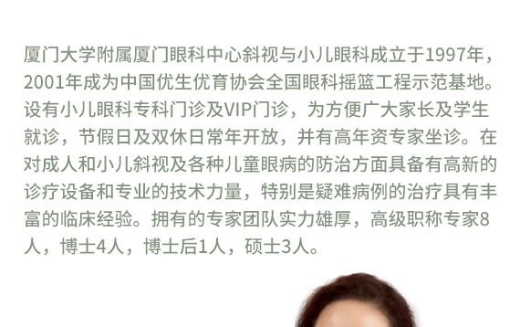 中國優(yōu)生優(yōu)育協(xié)會廈門眼科搖籃示范基地負(fù)責(zé)人,《中國斜視與小兒眼科雜志》編委,長期從事斜弱視、小兒眼科專業(yè)的臨床及應(yīng)用研究工作,兼任廈門大學(xué)醫(yī)學(xué)院及廈門醫(yī)學(xué)高等專科學(xué)校教學(xué)工作,對成人及兒童各種類型的斜視,包括特殊類型斜視、復(fù)雜性斜視的手術(shù)治療;低齡兒視功能發(fā)育性疾病的篩查及治療;兒童、青少年屈光不正、弱視治療等方面有著深入的臨床研究和豐富的經(jīng)驗積累。先后主持和參與福建省、廈門市科科研課題立項6項,《斜視診斷詳解》、《角膜膠原交聯(lián)技術(shù)及臨床應(yīng)用》專著編委,近期在國家級及省級學(xué)術(shù)刊物發(fā)表專業(yè)論文20余篇,曾先后赴美國、法國、新加坡、日本等國家進(jìn)行參觀學(xué)習(xí)和國際眼科學(xué)術(shù)交流。