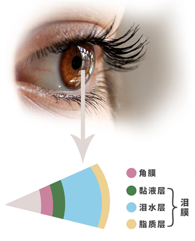 我們的眼睛會分泌淚液,而淚液會在我們眼睛表面形成一層淚膜,它是由三種成分組成,分別是油脂、水液、黏蛋白。