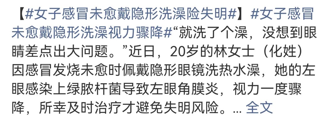 日前,一則#女子感冒未愈戴隱形洗澡險(xiǎn)失明#的新聞沖上熱搜: